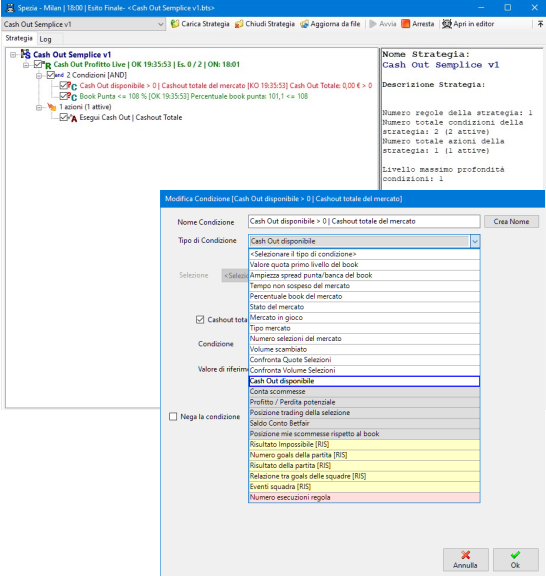 Strutturata con un sistema ad albero, con l'Automazione di Betting Toolkit puoi combinare facilmente tra loro Regole, Condizioni ed Azioni e per ognuna di esse una descrizione dettagliata ti aiuterà nella costruzione logica della tua strategia automatica.