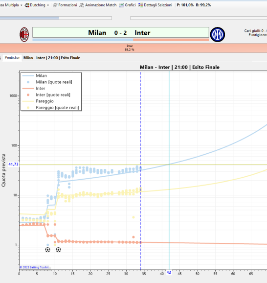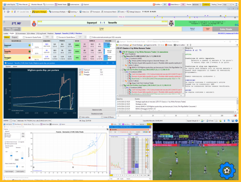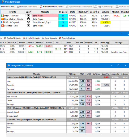 Indispensabile soprattutto quando si sta facendo trading su più mercati, il Monitor Mercati non solo permette di avere sempre disponibili le informazioni più importanti, ma consente al suo interno di utilizzare l'Automazione e perfino di fare Cash Out con un solo click su tutti i mercati che sta monitorando sia dello stesso evento sia di eventi diversi.